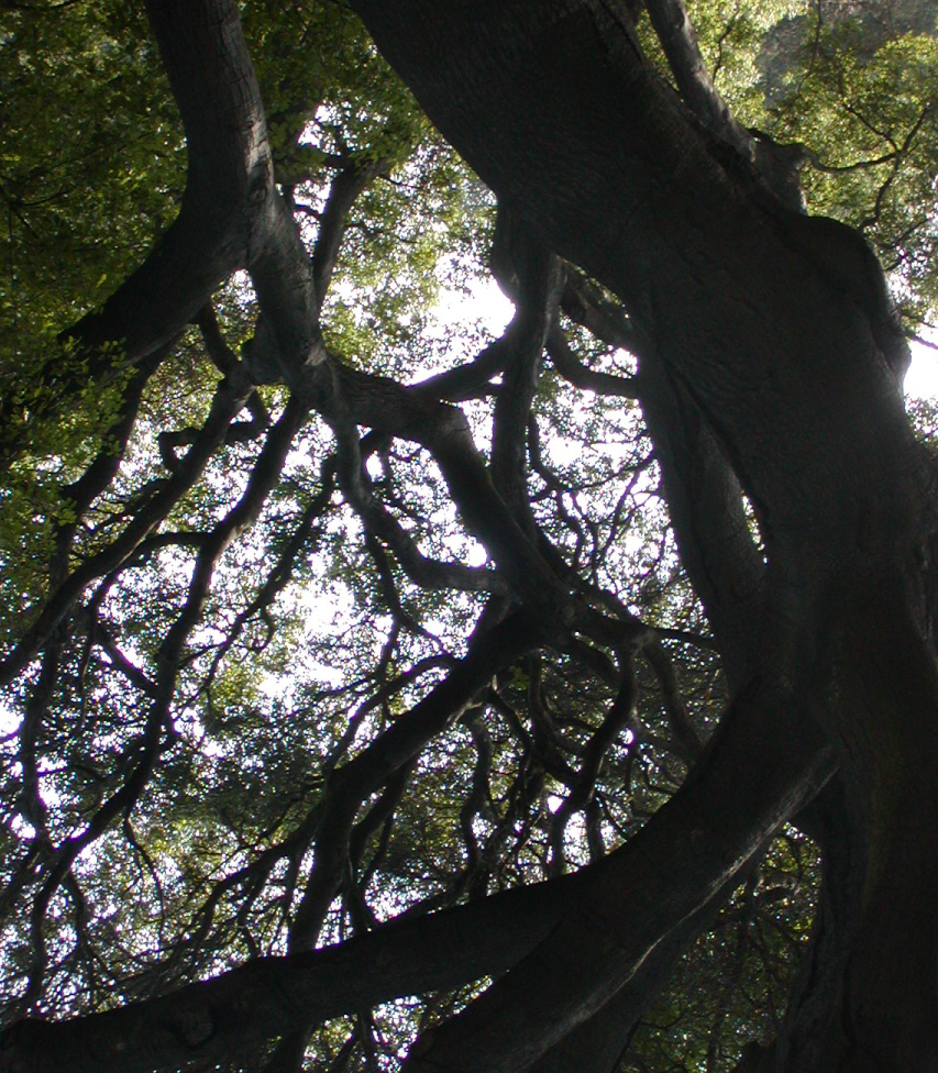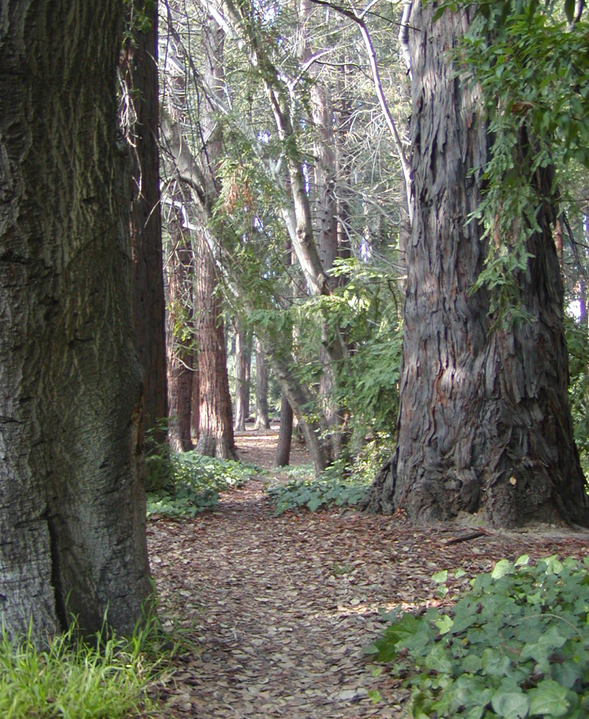 Peering through redwoods toward the Eucalyptus Grove