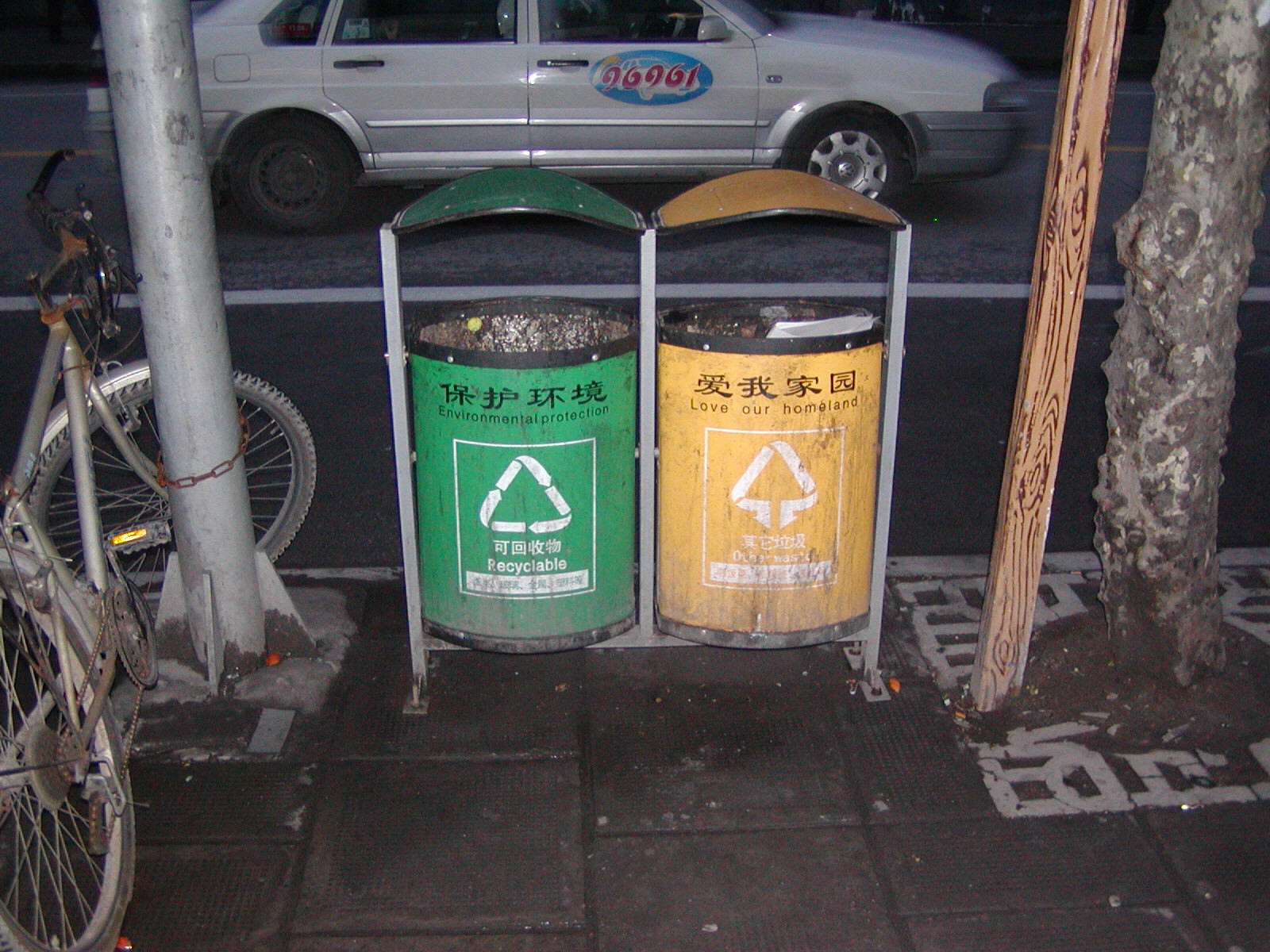 Homeland security Shanghai style: the trash bins say "Environmental protection" and "Love our homeland"